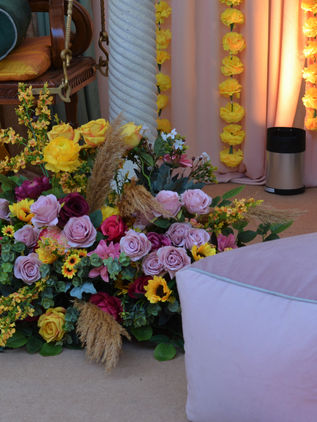 A breathtaking Mehndi setup featuring a beautiful blend of dusty pink, vibrant yellows, and lush green foliage. Vintage props, bold drapes, and comfy cushions create an enchanting atmosphere, while the playful pops of colour throughout add an extra layer of fun. The perfect combination of muted pastels and vibrant accents, designed to make your celebration luxurious, lively, and truly unforgettable.